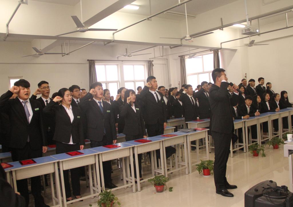 16时许,团总支书记张欣瑞宣布大会开始。全体起立,高唱国歌,伴随着庄严昂扬的国歌声,大会拉开帷幕。大会第二项,由曹耀辉宣读了经金学院第一届学生会干部任职决定。大会第三项,由何蕾为新聘任的学生会干部颁发聘书并合影。大会第四项,全体新聘学生干部佩戴工作牌,同学们郑重地将工作牌待在自己的胸前,他们带上的不仅仅是小小的工作牌,更是沉甸甸的信任和责任。大会第五项,全体新任学生会干部进行就职宣誓,“服务同学,历练自我”,希望学生干部们能在以后的工作中踏实践行今天的誓言。接下来,由第一届主席王超做表态发言,他表示自己将带领团队做好本职工作,不断开拓创新,带领学生会做好老师和同学们之间的桥梁,协助老师工作,尽心服务同学。