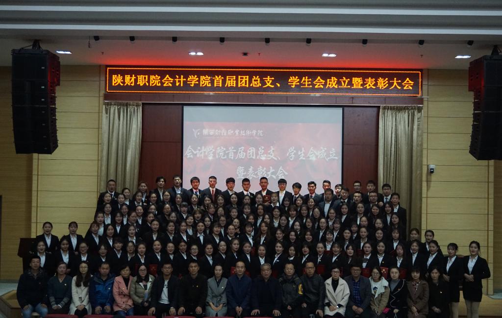 大会在会计学院学生会全体成员共同录制的视频《最特别的我们,最美好的一二三》和一首由学生干部代表改编演唱的《陕财院版小幸运》中拉开帷幕。短短几分钟的视频,和学生深情地献唱:“你说陕财格桑如画般美丽,不及财院遇见你,是我最美好的幸运”。生动地讲述了他们与会计学院之间的青春故事,也寄托了对全院师生的祝福。随后,由上届学生会主席尹琳娜对2017学年至2018学年学生会工作做了总结发言。讲述了他们成长的心路历程、点滴回忆,内容深刻,感人至深。接着,贺适宣读了《关于表彰2017-2018学年会计学院“优秀学生干部”的决定》。在动感激昂的音乐声中,李启明、乔晶策、贺适为优秀学生干部颁发荣誉证书。表彰完老一届优秀学生干部后,乔乐宣读了《关于会计学院首届团总支,学生会干部的任命决定》。李启明,乔晶策,贺适,曹崇禧,赵静,乔乐分别为新聘任的学生干部颁发聘书。责任传递、薪火相传,会计学院一二三系学生会主席团向会计学院首届团总支、学生会主席团佩戴胸牌。将我院学生干部的优良传统一代一代地传承下去,他们放声呐喊:“无论行至何处,不管身在何方,都将做最好的自己,让会计学院倍感骄傲,为陕西财经职业技术学院增添荣光”,将“服务同学,历练自我”的学生会精神发扬光大。并衷心祝愿陕西财经职业技术学院“桃李满天扬四海,硕果累累振中华”。会计学院首届学生会主席辛季蓬做表态发言后,由副主席马明杰带领团总支、学生会干部庄重宣誓,“团结奋进、追求卓越,服务同学、历练自我”的声音在报告厅里久久不能平息。