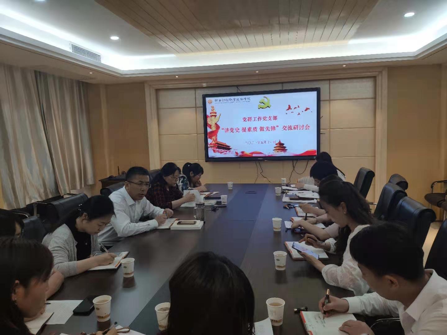 5月11日下午,党群工作党支部在实训楼二楼会议室召开党史学习教育 “讲党史、提素质、做先锋”交流研讨会。支部全体党员参加,会议由支部书记穆天楠主持。