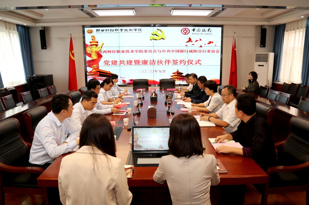 为推动基层党组织建设,提高党建工作水平,9月29日下午,我院在办公楼四楼会议室与中国银行咸阳分行举行党建共建暨廉洁伙伴签约仪式。中行咸阳分行党委书记、行长任卫东,党委委员、纪委书记杜秋玲,纪委办公室主任韦民,党务工作部主任金苗,行长办公室主任张龙,个人数字金融部主任方晓梅,学院党委书记张志华、党委副书记兼纪委书记刘文青、党委副书记朱华斌以及党政办公室、党委组织部、纪委综合室负责人等出席签约仪式。签约仪式由朱华斌主持。