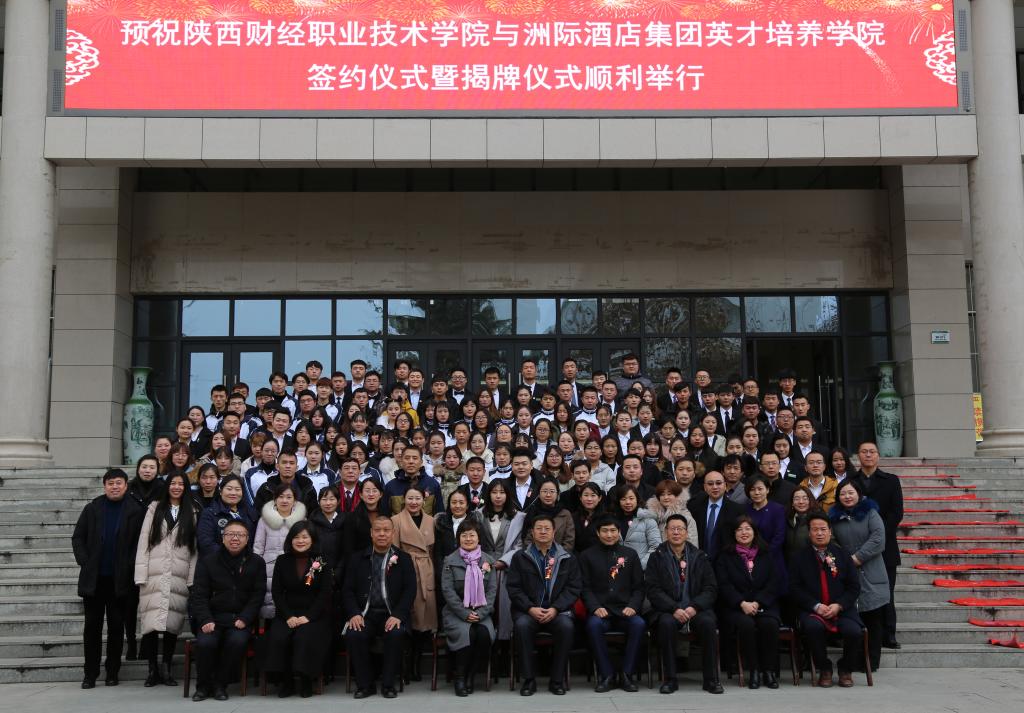 在热闹欢快的拉丁舞中,此次签约仪式圆满结束。洲际酒店集团一行、陕西财经职业技术学院领导和英才学院的学生们在综合楼前合影留念。