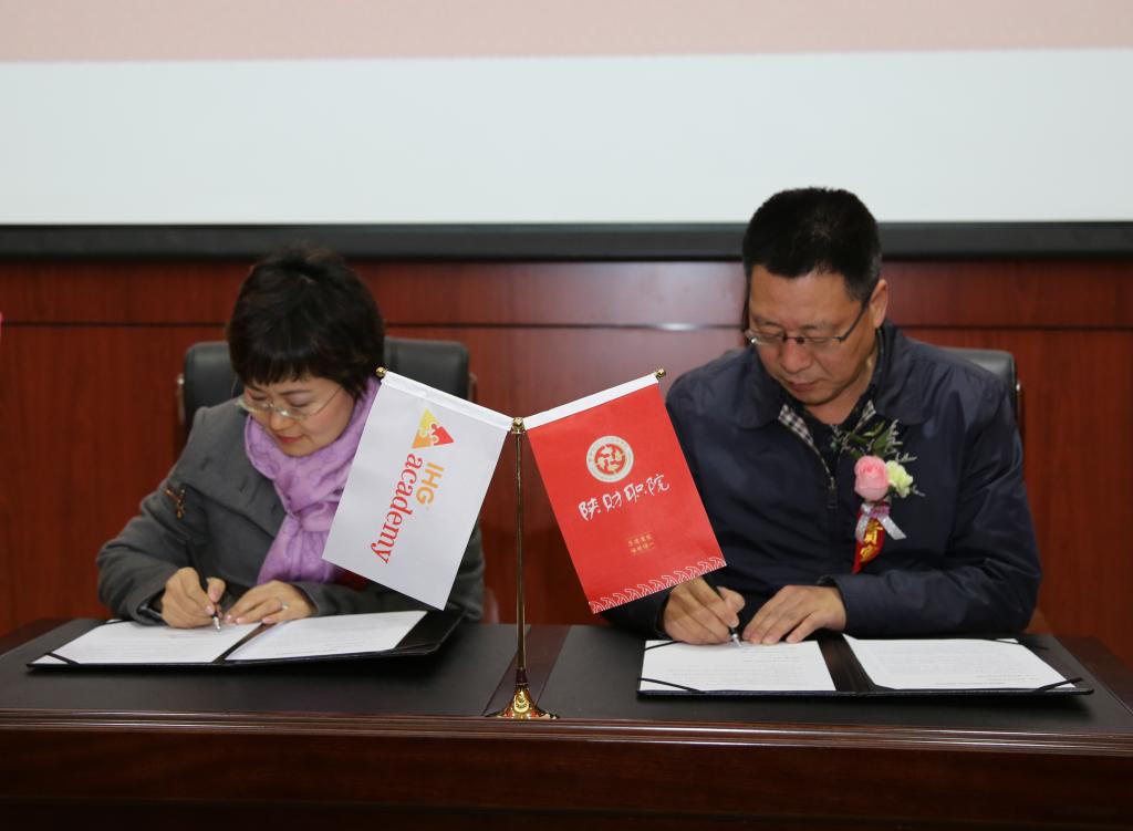 12月28日下午2时30分,我院与洲际酒店英才培养学院签约暨揭牌仪式在学术报告厅隆重举行。洲际酒店集团中国北方区资深人力资源总监席瑛、西安中晶华邑酒店总经理朱光、西北区域人力资源项目负责人及西安中晶华邑酒店人力资源总监胡洁女士、西安中晶华邑酒店的管理团队一行8人出席了此次活动。学院党委书记张志华、副院长范忠、教务处处长马西牛、商学院院长董媛、商学院党总支书记兼副院长张晓战、商学院副院长李福顺、各二级分院、各处室的相关负责人及商学院全体师生共计450余人参加了本次签约仪式。