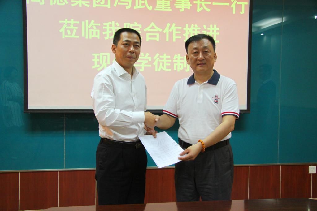 在友好的氛围中,院长阎平和高德集团总裁冯武签订了学徒制试点工作战略合作协议,标志着我院学徒制试点工作正式启动。