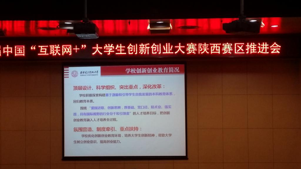 2016年4月14日上午,第二届中国“互联网+”大学生创新创业大赛陕西赛区推进会在西安电子科技大学南校区举行。我院副院长范忠、教务处处长陈验风和经济与金融管理系副主任景海萍参加了会议。会议由省教育厅高教处处长范永斌主持,全省92所高校相关校领导及主管部门领导约300余人参加了会议。