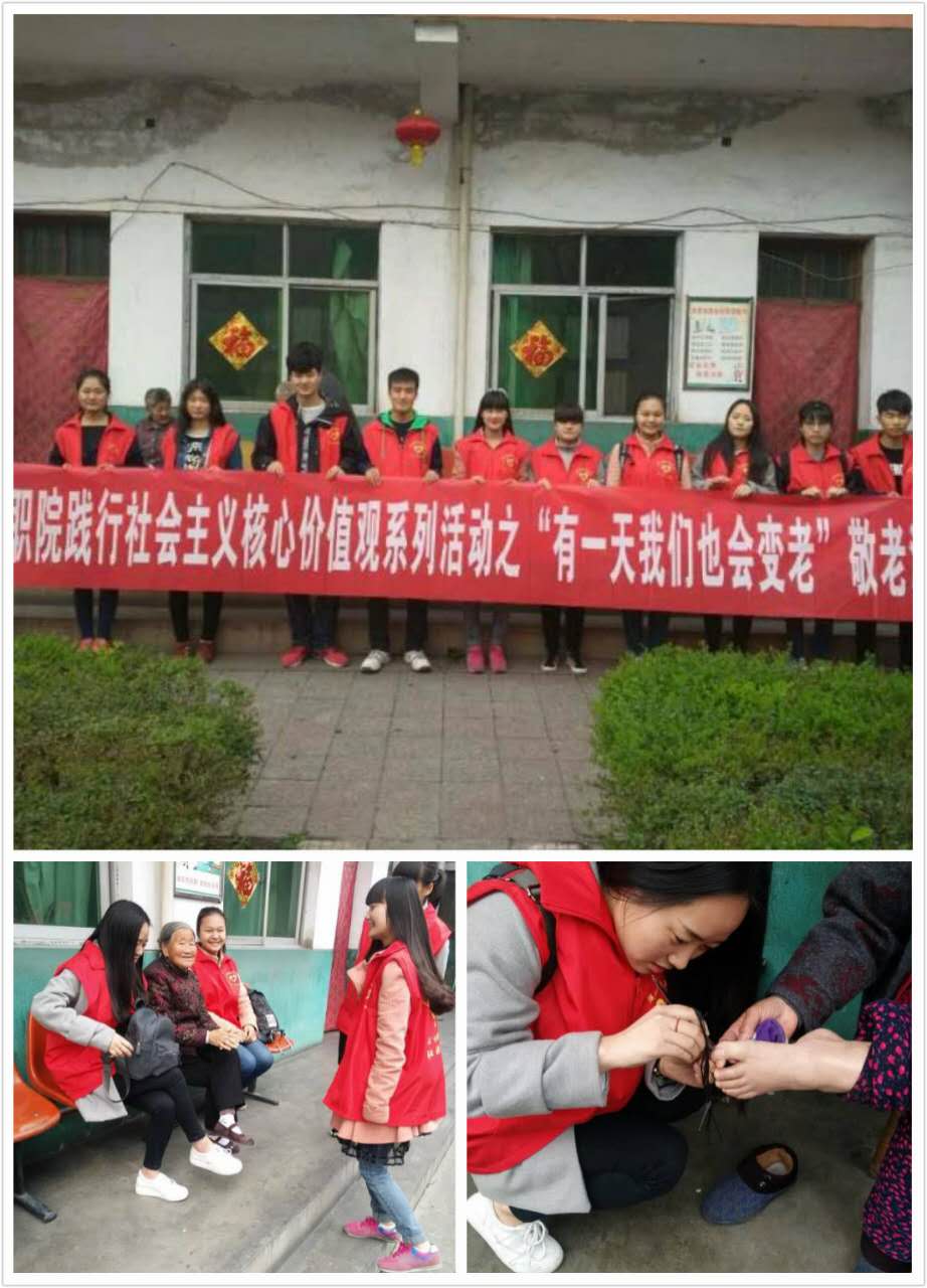 3月25日下午,我院“聚善”青年志愿者服务协会组织50余名志愿者前往“夕阳红”敬老院开展“有一天我们也会变老”关爱空巢老人活动。志愿者们为老人表演了精心准备的节目,并且与敬老院的老人结成了对子,志愿者们表示不仅在校期间会经常来看望老人即使在毕业之后他们也会经常回来看望这里的老人。敬老献爱心志愿活动在我我院已经开展了十余年。十年如一日做着同样一件事情,不一样的是在这个过程中每次参与的不同学生都会受到不同的启示和教育,这才是我们想要的。志愿者服务不是一天两天的表面工作,更重要的是贵在坚持,这不仅是弘扬志愿服务精神,更是在志愿服务中深化对“中国梦”和社会主义核心价值观的情感认同,将孝文化根植于学生的心中。