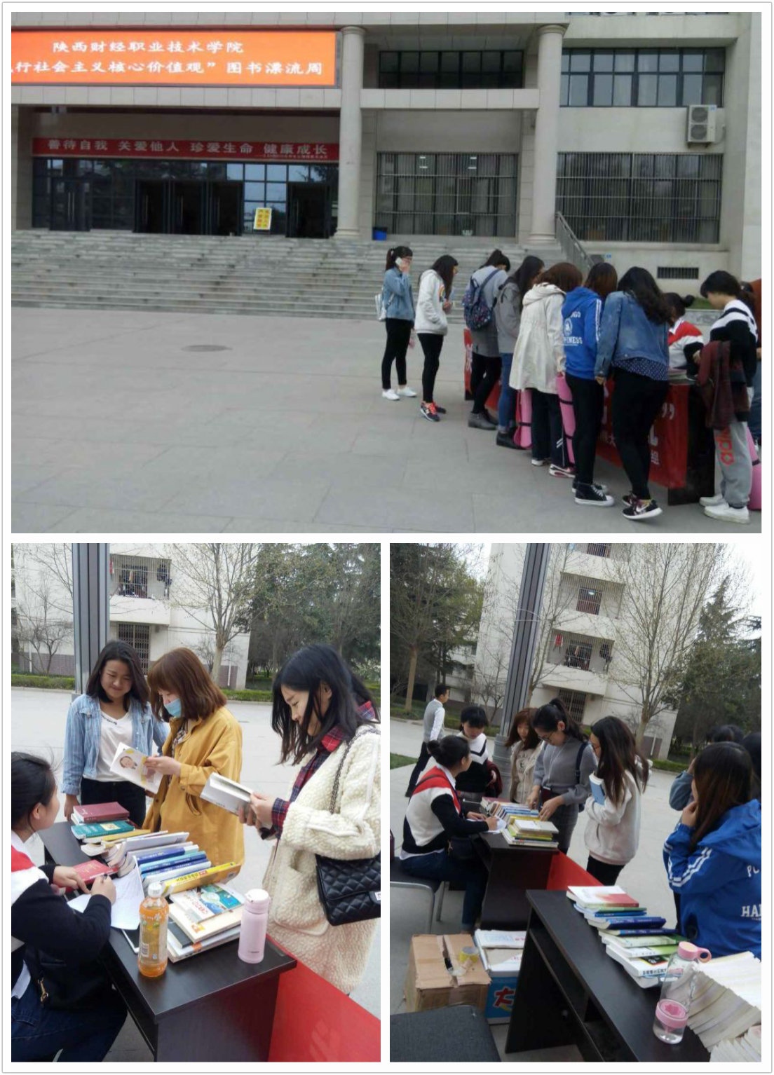 3月29日下午,我院社团联合会联合陕西大学生在线“读书漂流”组在我院综合楼前开展了为期一周的“践行社会主义核心价值观”图书漂流活动,本次活动共借阅出书籍约200多本。