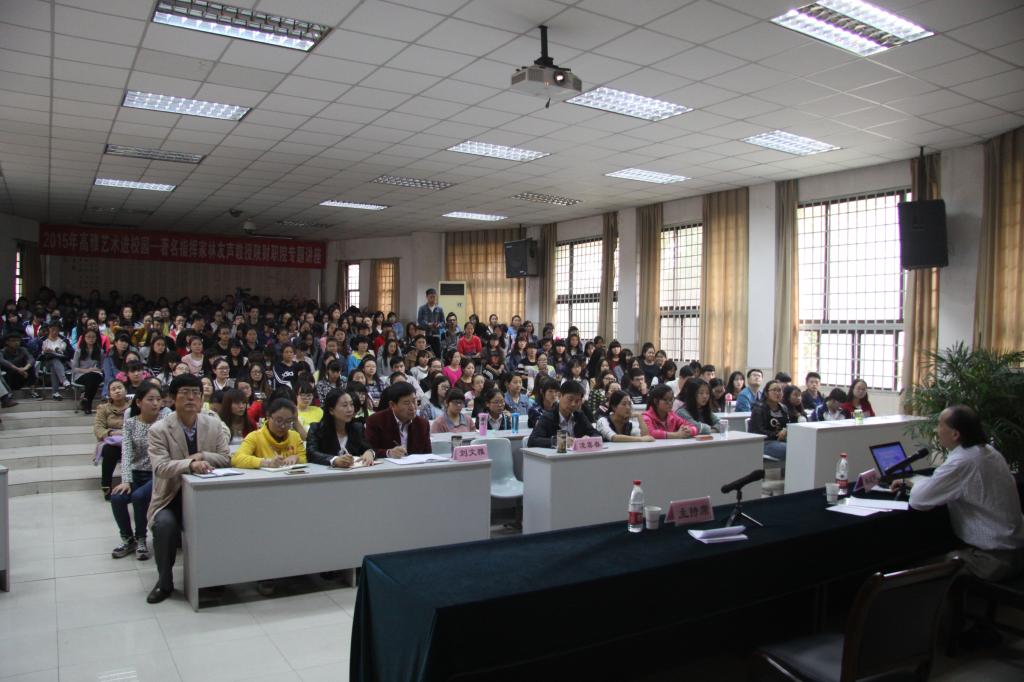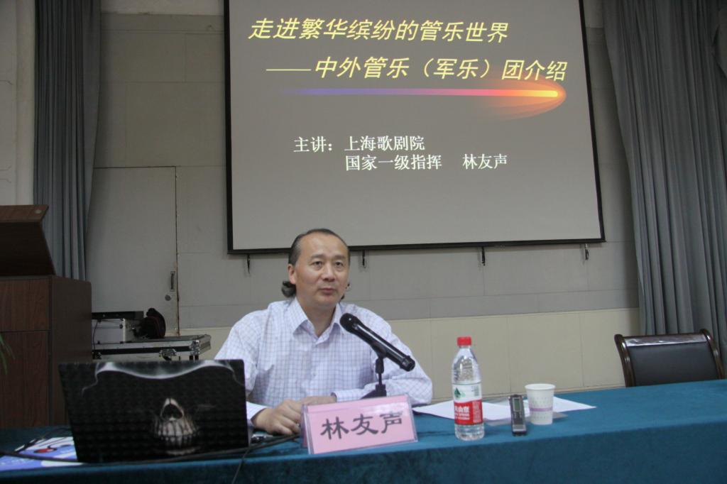 10月20日下午4点,我院在东阶梯教室成功举办了2015年高雅艺术进校园艺术专家讲座。本次讲座邀请到了上海歌剧院国家一级指挥,上海音乐学院兼职教授、硕士生导师,华东政法大学兼职教授,上海大学兼职教授,汕头大学客席教授林友声。他以《走进缤纷多彩的管乐世界——管乐器及中外管乐队介绍》为题为我院师生做了一场精彩绝伦的艺术讲座。学院党委书记凌喜春、党委副书记兼纪委书记刘文雅出席讲座,学院部分处室负责人,师生代表共280余人参加讲座。宣传处副处长朱永斌主持讲座。