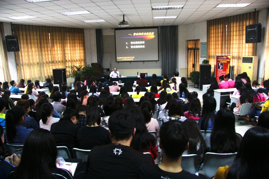 林教授通过精彩的讲解,让我们全面的了解了中外管乐队的基本情况、发展历史及管乐团的分类,并通过视频与讲解相结合的形式让师生更加生动直观地认识了管乐团的构成乐器及特点。为我们揭开了管乐团那层神秘的面纱,让我们感觉高雅艺术不再遥远,同时也感受到高雅艺术不可抗拒的魅力。