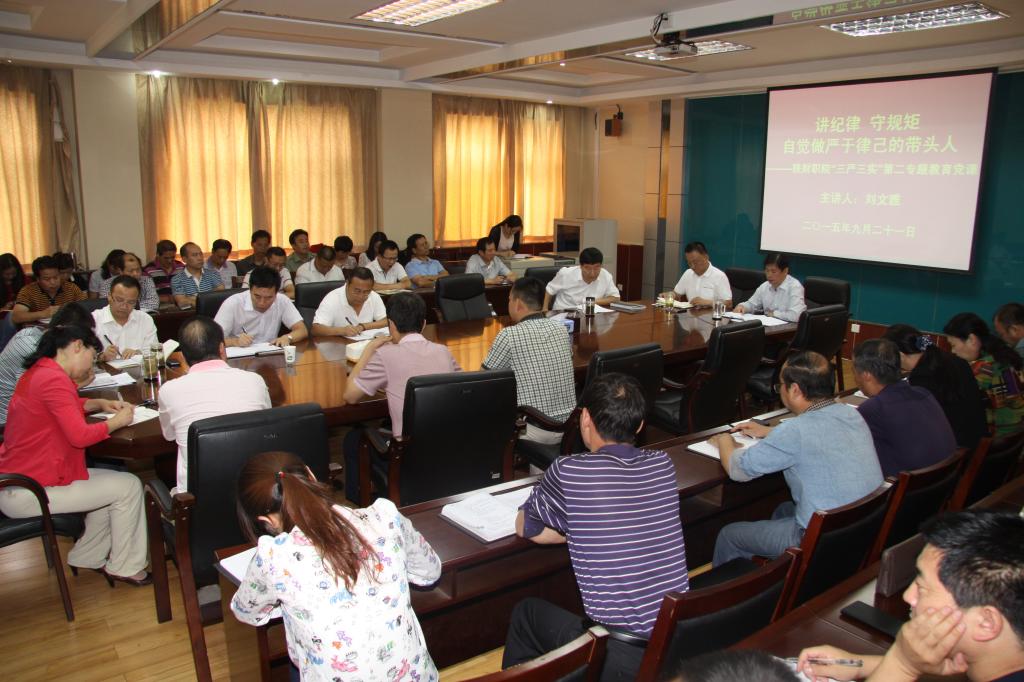 9月21日下午,我院在办公楼四楼会议室举办“三严三实”第二专题教育党课,学院党委副书记兼纪委书记刘文雅主讲了题为《讲纪律守规矩自觉做严于律己的带头人》的专题党课。学院全体处级中层以上干部及党务工作者50余人参加。