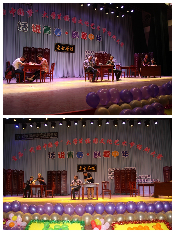 本次大赛历时一个多月,经过各系初选及多次彩排,最终决赛在热闹而又隆重的气氛下拉开帷幕。会计一系的《梦想啊梦想》造型华丽,大胆夸张,幽默中不失感动,让人捧腹;南校区的《雷雨》情感细腻,表演到位,深刻而富有内涵,引人深思;经济与金融管理系的《爆笑三国》时尚穿越,笑点不断,雷人剧情编排,尽显才情;会计三系的《新编茶馆》复制经典,二次创作,结局出人意料,发人深省;会计二系的《白雪公主》童话世界,完美梦想,矮人舞蹈笑翻全场,表现抢眼。现场观众都被同学们的表演深深打动,掌声不断,笑声不断,个性鲜明的剧中人物带领观众穿越时代,触摸经典。
