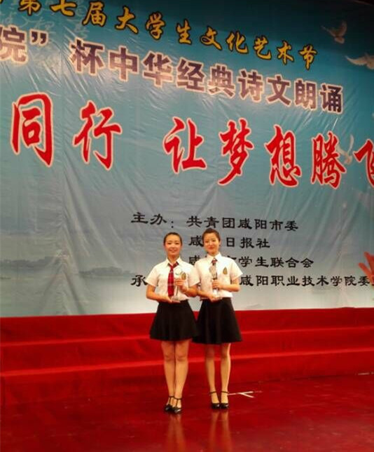 5月19日下午,咸阳市“第七届大学生文化艺术节——中华经典诗文朗诵大赛”在咸阳职业技术学院举行,全市共有11所大中专院校2000余名大学生踊跃报名参加。我院参赛选手鱼萌、王阳以《与经典同行为青春导航》为题的朗诵作品获得大赛优秀奖。