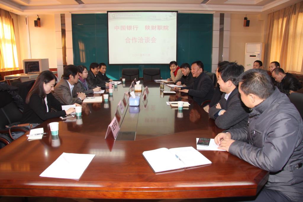 1月19日,我院与中国银行举办校企合作洽谈会。中国银行金融商务人力资源总监赵晶刚一行专程到我院进行了考察与会谈。学院院长阎平,副院长王文汉,招生就业处、教务处、党政办、宣传处及各系部负责人参加了座谈会。