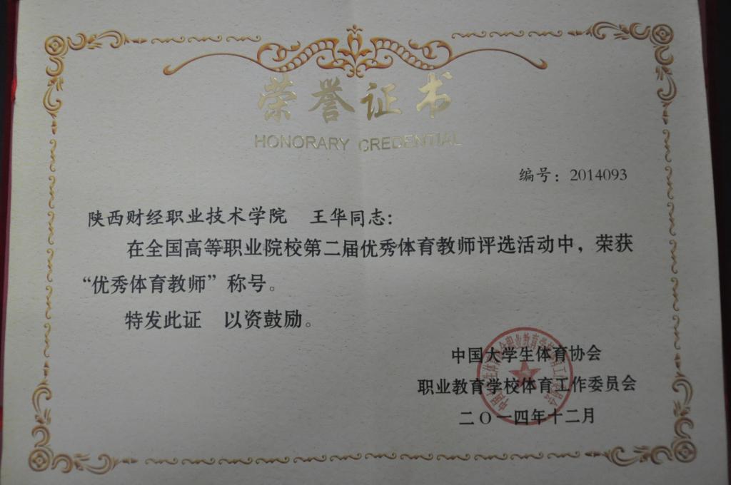 2014年12月18日至22日,中国大学生体育协会职业教育学校体育工作委员会2014年度年会在广西体育高等专科学校召开,大会宣布了全国职业院校优秀体育教师的评选结果,我院体育部教师王华同志荣获第二届全国高等职业院校优秀体育教师荣誉称号。