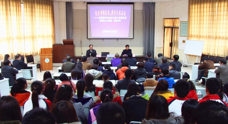 11月28日下午,陕西省人大常务委员会委员、副秘书长张建申教授来我院做了题为《坚定理想信念 提升文化品位——自觉践行社会主义核心价值观》的专题讲座。院党委书记凌喜春主持,党委副书记兼纪委书记刘文雅与学院党政、学管部门负责人及工作人员、各系专职副书记、辅导员及学生代表200余人到场听取讲座。