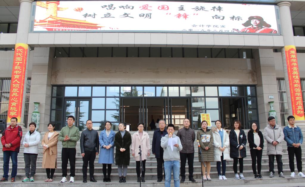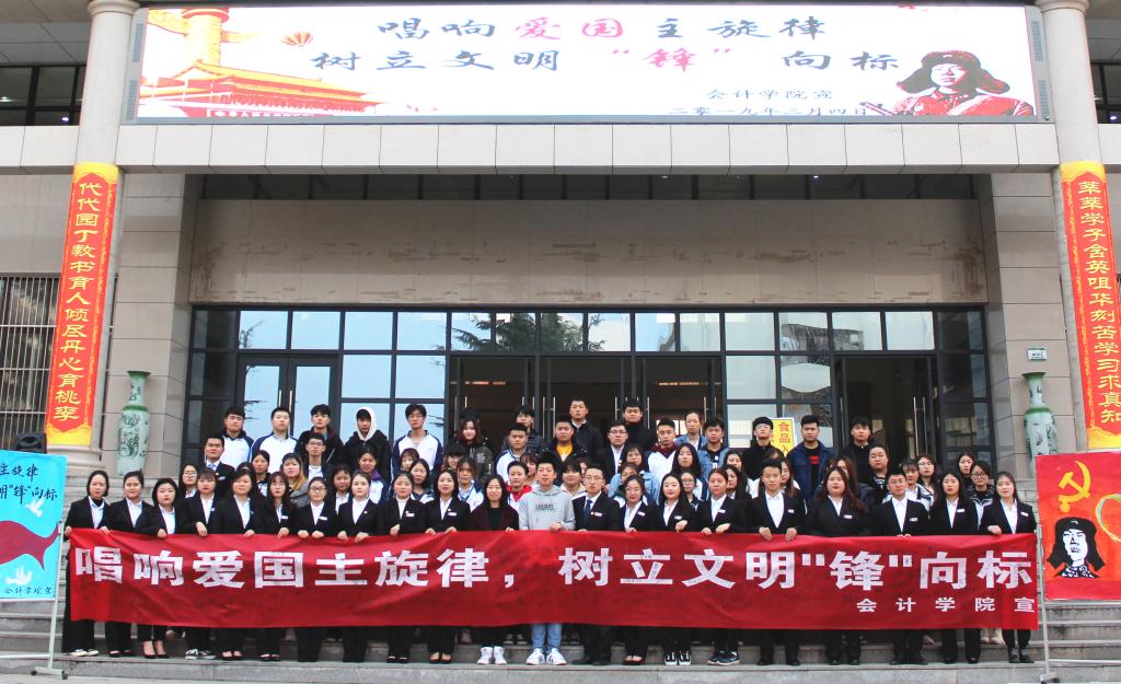 2019年3月4日下午4点,会计学院在综合楼前举办了“唱响爱国主旋律,树立文明‘锋’向标”学雷锋主题教育活动月启动仪式。会计学院院长李启明、党总支书记乔晶策、会计学院全体辅导员以及400余名学生共同参与了此次活动。