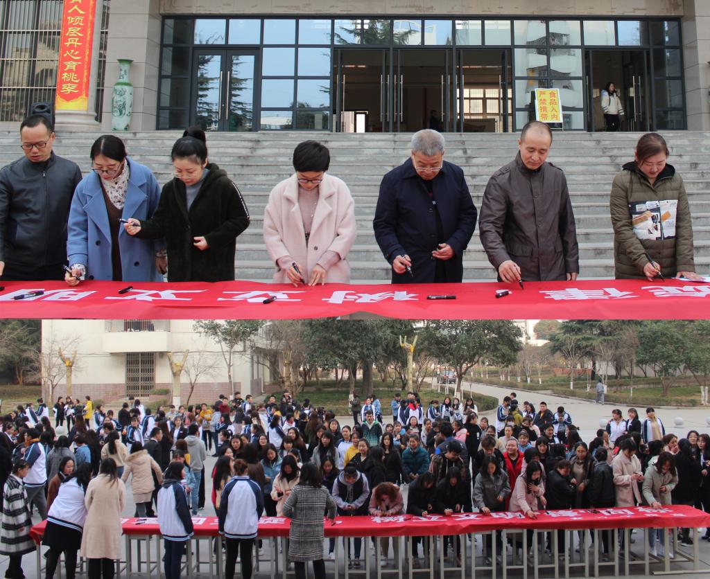 | 全体师生在“唱响爱国主旋律,树立文明‘锋’向标”的横幅上写下了自己的名字 |