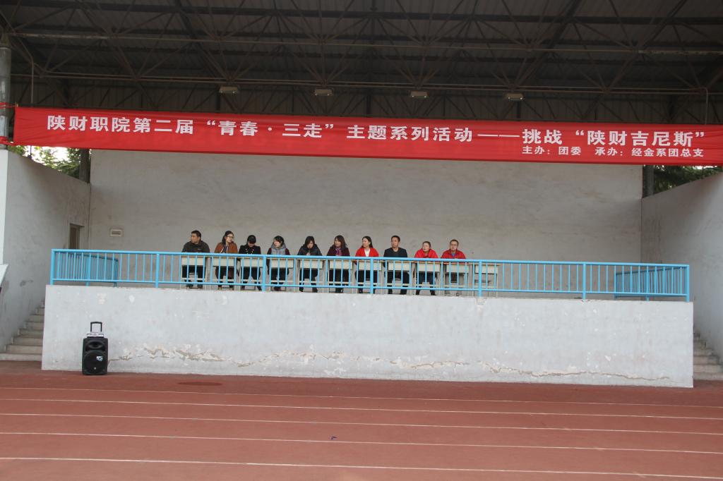 为响应我院团委“践行社会主义核心价值观,争做向上向善好青年”的组织号召,鼓励大学生“走下网络,走出宿舍,走向操场”,营造大学生健康成长的良好氛围,丰富校园课余文化生活。2016年11月7日下午四点,经济与金融管理系在我院操场举行“青春·三走”——挑战“陕财吉尼斯”开幕式。出席本次活动的有保卫处副处长兼学生处副处长郭宝东、团委书记窦曼娟、经济与金融管理系副主任景海萍、副主任董媛、专职副书记王省军、会计一系团总支书记张欣瑞、会计三系团总支书记吕斌以及经金系全体辅导员。活动由经金系团总支书记袁永彦主持。