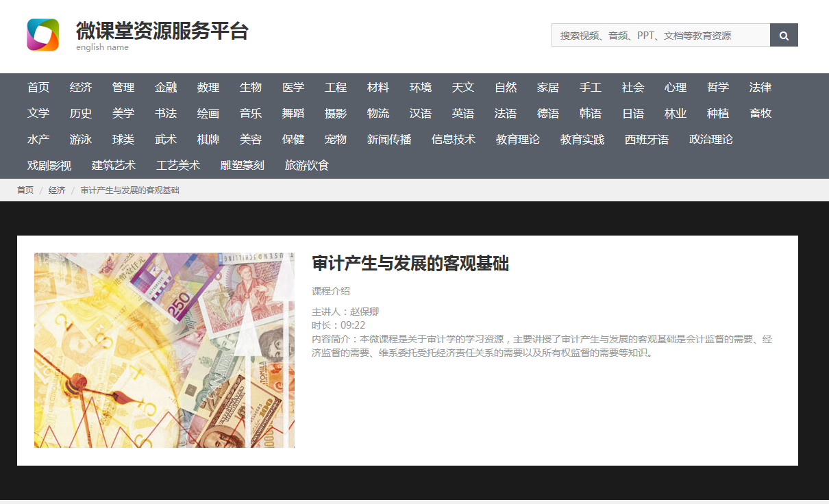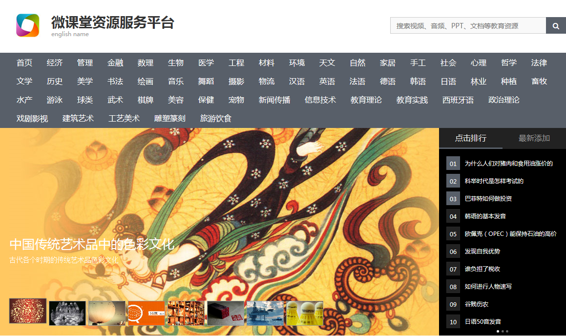 《微课堂资源服务平台》共分经济,管理,金融,数理,生物,医学,工程,材料,环境,天文,自然,家居,手工,社会,心理,哲学,法律,文学,历史,美学,书法,绘画,音乐,舞蹈,摄影,物流,汉语,英语,法语,德语,韩语,日语,林业,种植,畜牧,水产,游泳,球类,武术,棋牌,美容,保健,宠物,新闻联播,信息技术,教育理论,教育实践,西班牙语,政治理论,戏剧影视,建筑艺术,工艺美术,雕塑篆刻,旅游饮食等50多个科目。