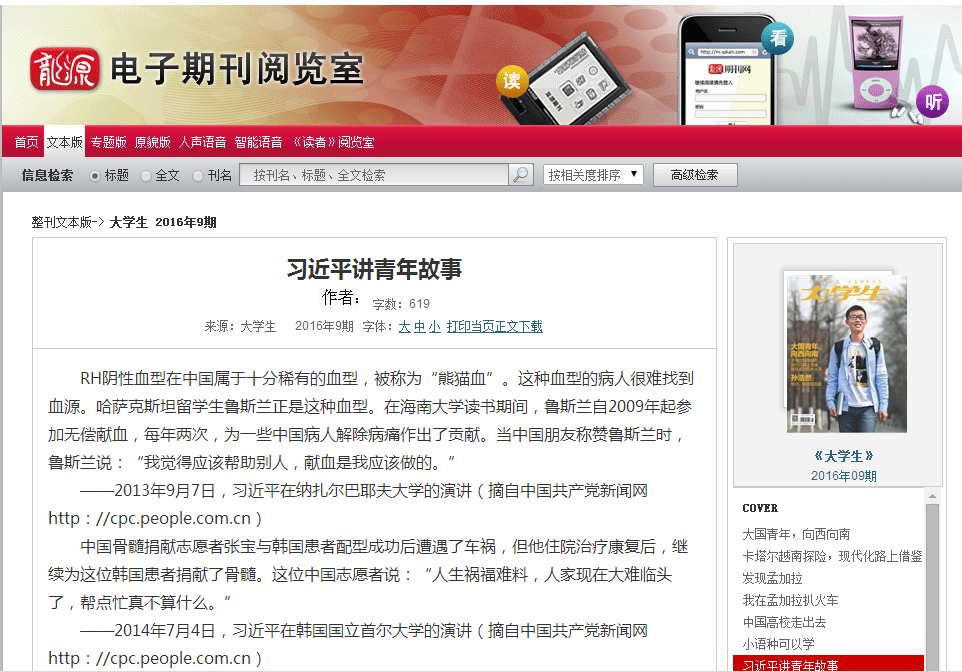 龙源期刊最大的特色就是多版立体阅读,分别是:整刊版,提供刊物的目录和全文,以及往期检索,读者可以更直接的选择自己喜爱的期刊阅读。专题版, 完全突破每本杂志的局限,按照不同的类别划分不同的专题,使读者聚焦自己感兴趣的话题。 原文原貌版, 原汁原味,再现纸板期刊原貌,无需下载安装浏览器,电子版翻阅更便捷。 语音版,打破期刊文字的束缚,让我们的期刊“动”起来,男声女声两个版本的语音阅读,变读刊为“听刊”。