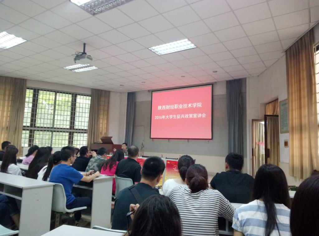 5月12日下午,由学生处、秦都区武装部、吴家堡办事处武装部组织的2016年大学生征兵政策宣讲会在我院东阶梯教室召开。秦都区武装部政工科科长黄超、军事科参谋雎璋、政工科干事刘卫疆、吴家堡办事处武装干事史亚娟一行四人对广大学生做了宣传动员,我院4名辅导员老师和240余名学生代表参加。