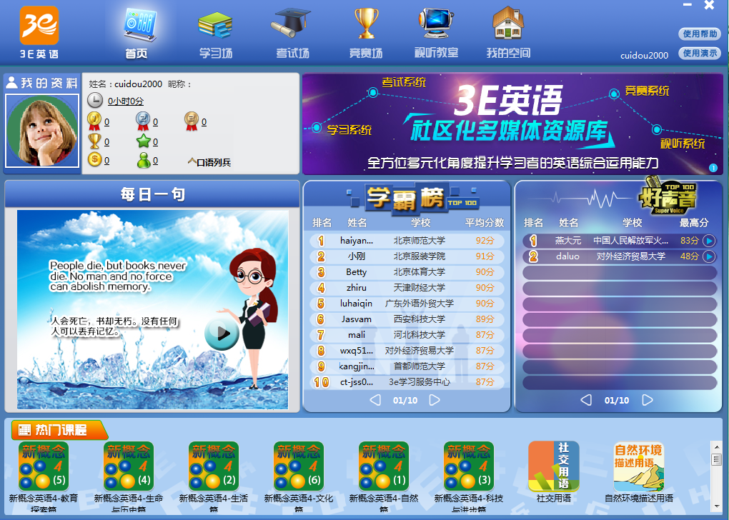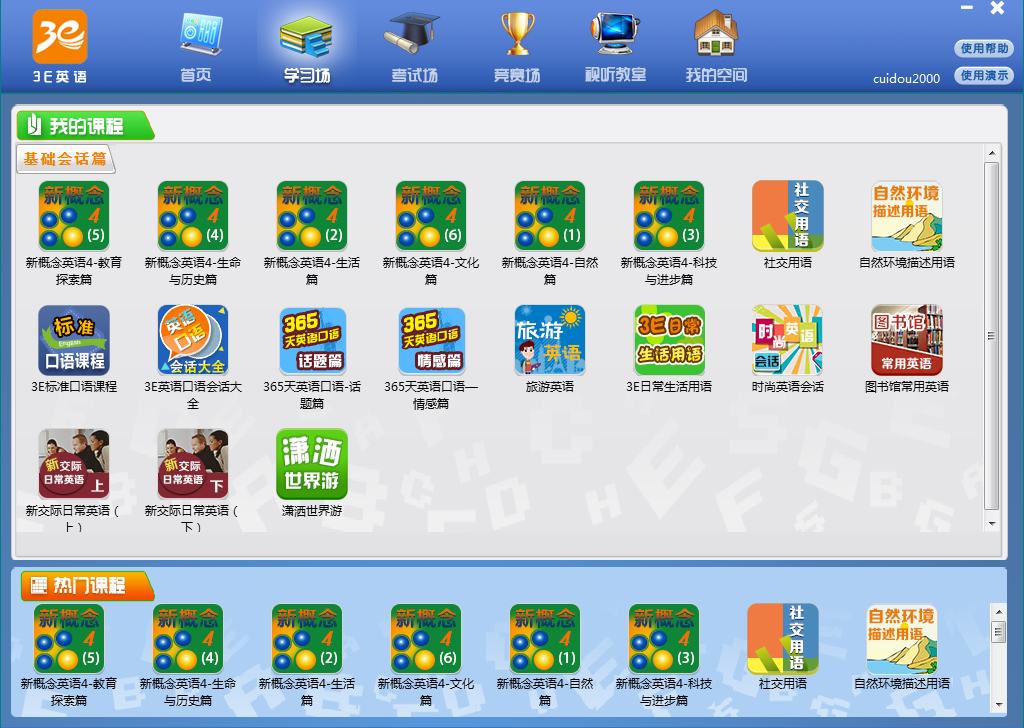 ◆丰富的课程资源。“3E英语”引进及制作了包括基础会话、新闻英语、考试通关、职场商务、原版小说、视听教室等诸多门类上万小时的课程资源,不仅可以满足学生在学习、生活乃至工作中需要的人际交流,更可以拓宽学生课外学习内容,增强学生自主学习兴趣。