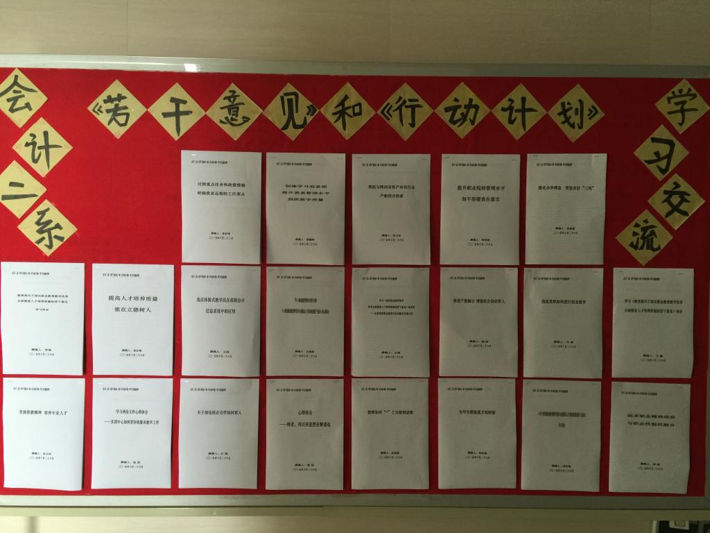 根据学院办公会议纪要精神,会计二系主任李启明先后在系党总支学习会及教学例会上要求全体党员及教工在认真深入学习《教育部关于深化职业教育教学改革全面提高人才培养质量的若干意见》和《职业院校管理水平提升行动计划(2015-2018年)》两个文件后,提交心得体会并制作学习交流展板。