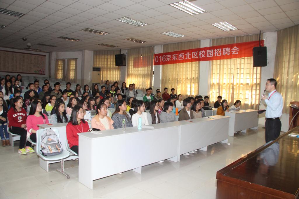 2015年10月14日星期三中午12时,在我校东阶梯教室成功举办了京东西北大区应届生招聘宣讲会,吸引了近两百名学生前来应聘。